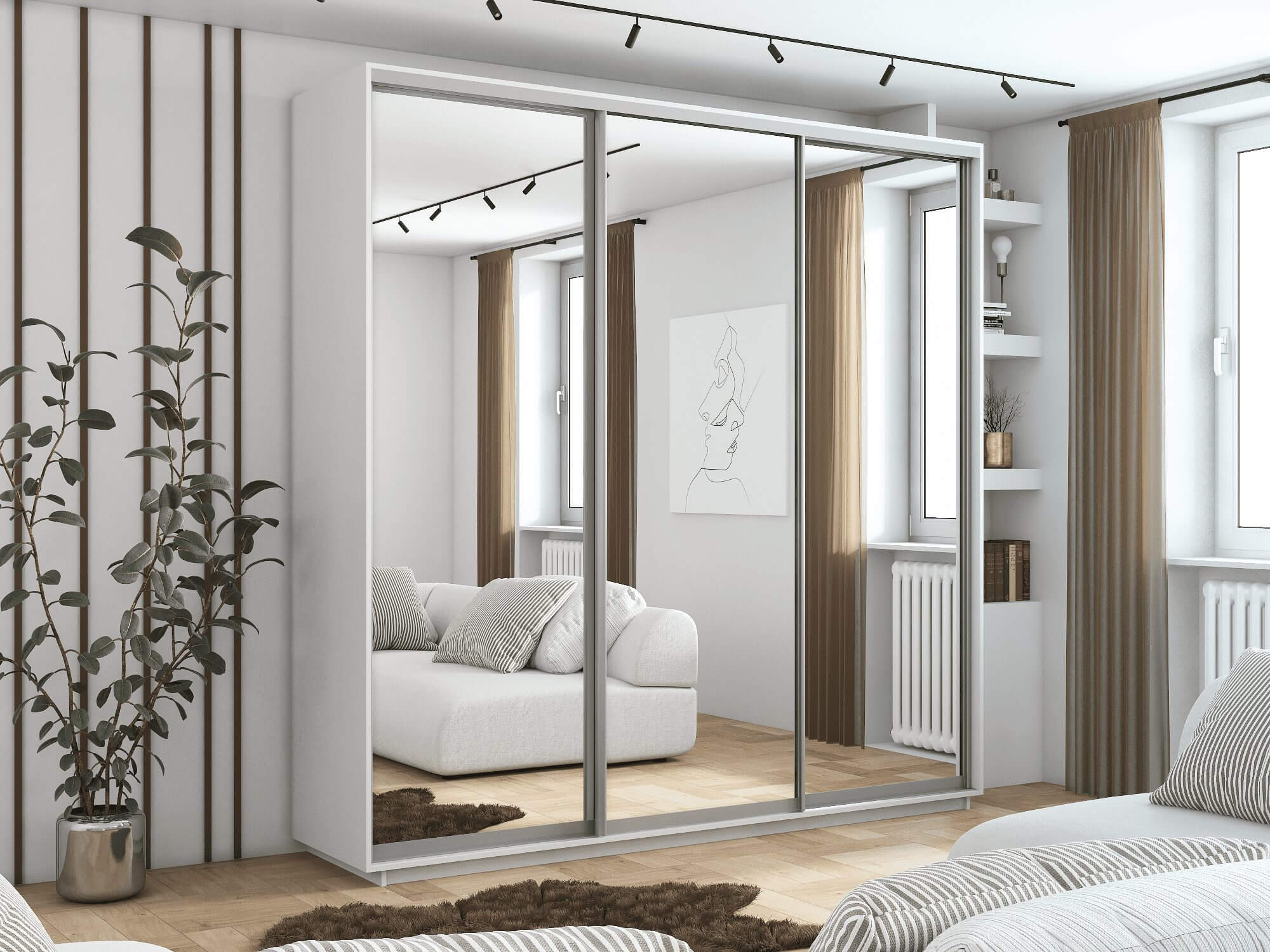 ארון בגדים עם דלתות מראה הוא רהיט מסוגנן ופונקציונלי לחדר השינה. המראות לא רק מוסיפות נופך של זוהר לחדר, אלא הן גם גורמות לחלל להרגיש גדול ומואר יותר.