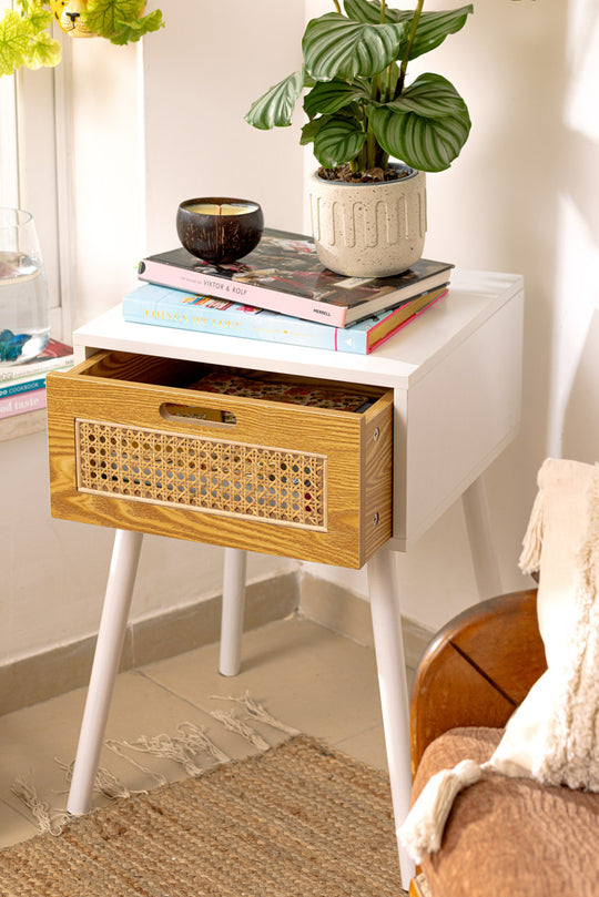 שידת צד מעץ בסגנון והו-שיק הניתנת להרכבה, בשילוב מגירת ראטן מרכזית וארבע רגליים אלכסוניות.